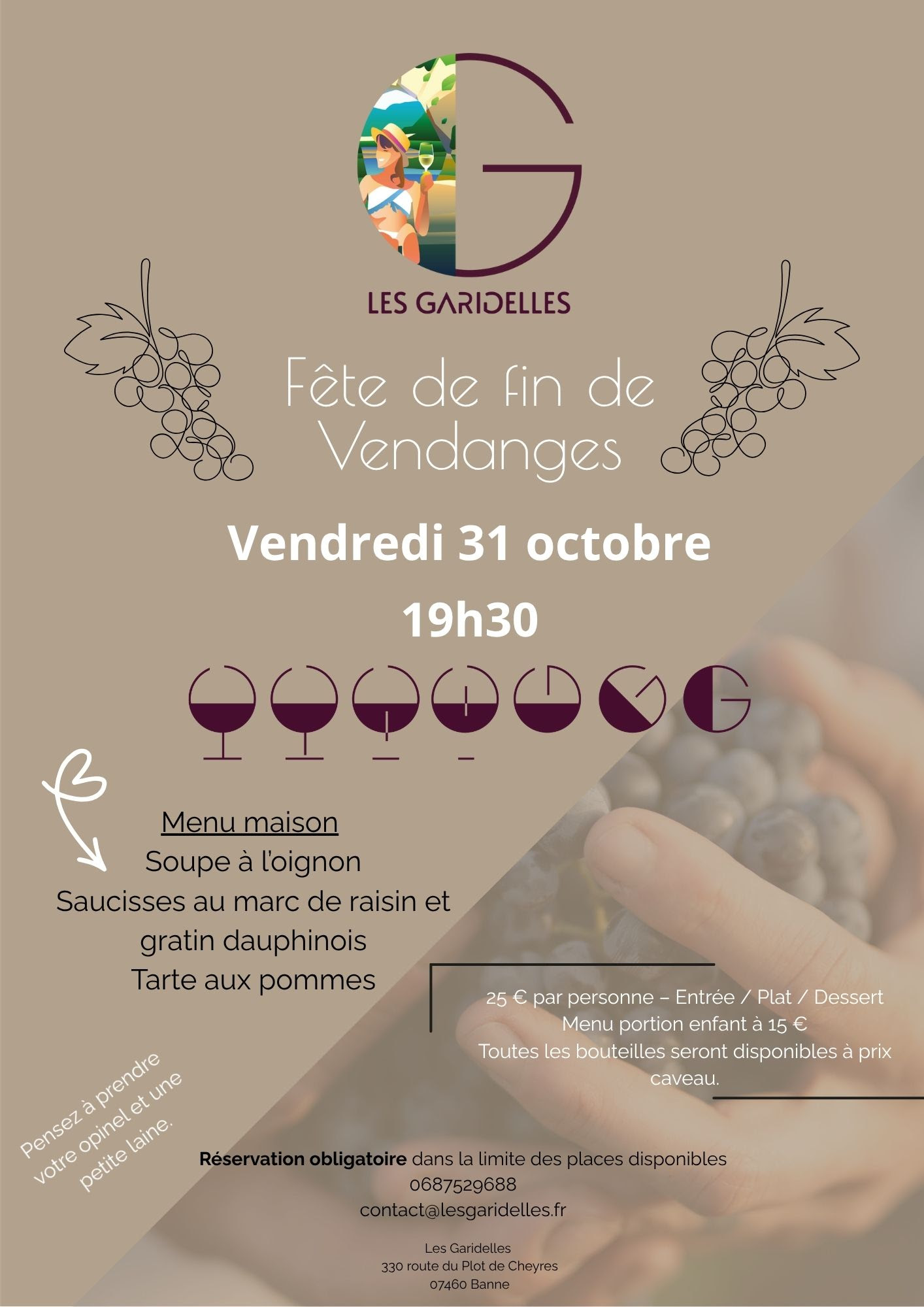 Un moment pour fêter la fin des vendanges, lever nos verres et profiter d’un peu de chaleur partagée. Pensez à votre opinel et à une petite laine.